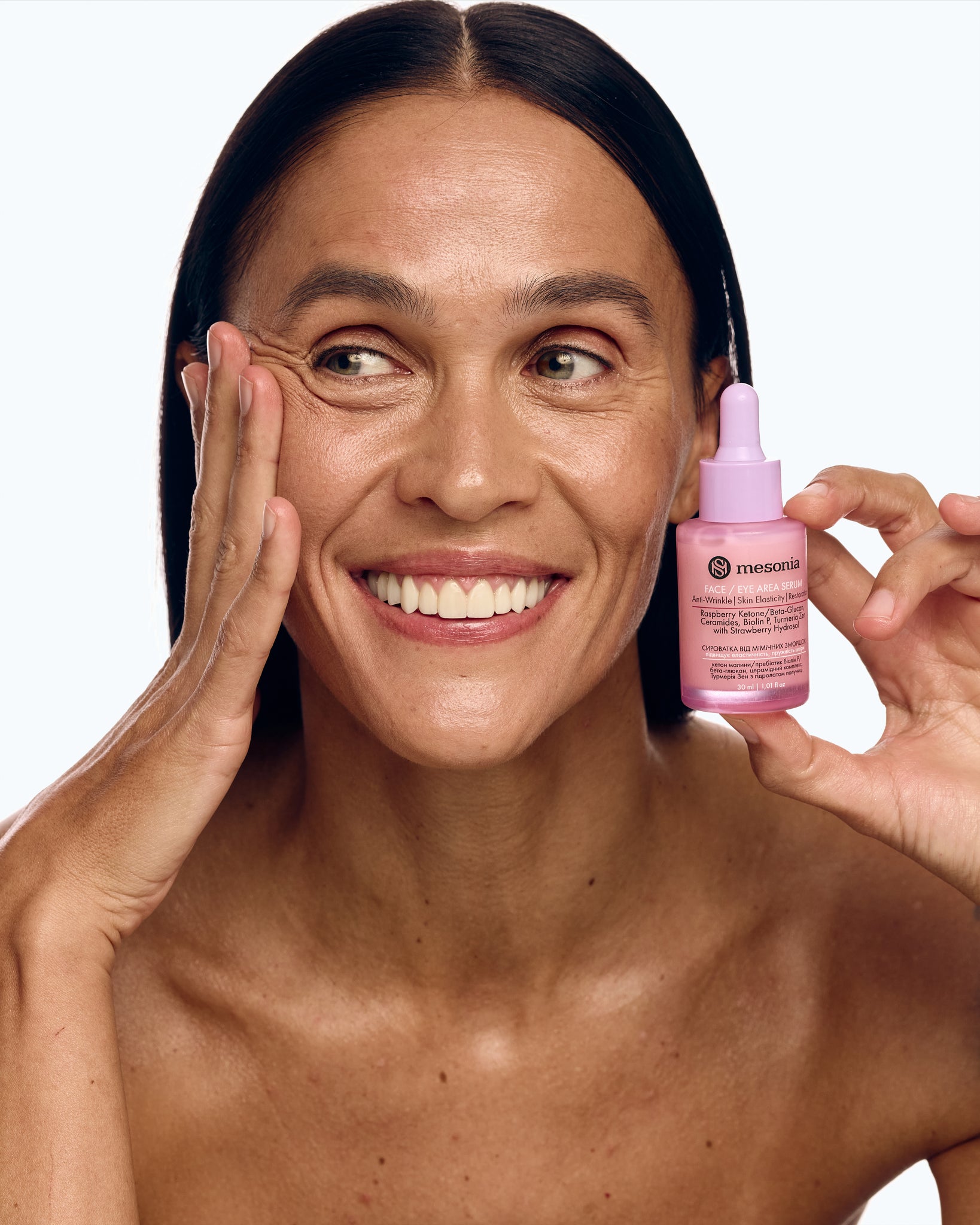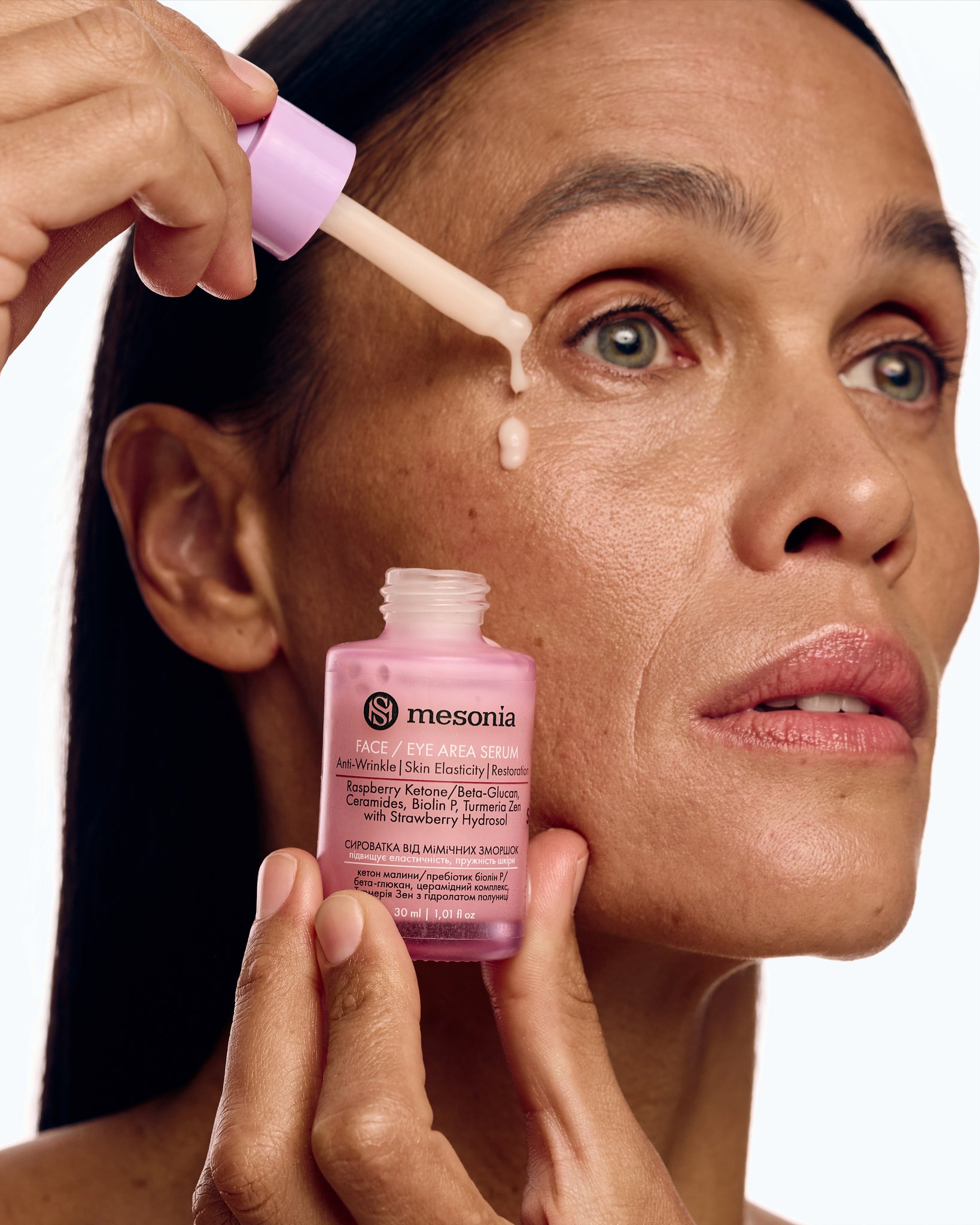 Сироватка від мімічних зморшок для обличчя і шкіри навколо очей, з кетонами малини, пребіотиками, Глюкан Форте, церамідним комплексом